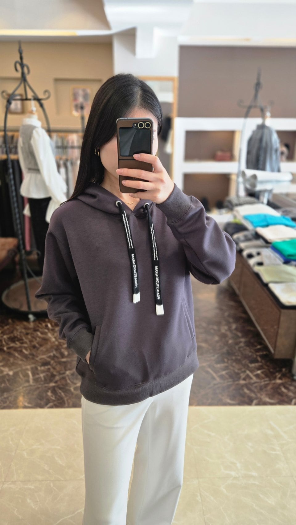 フードの紐にはロゴをあしらい、さりげないアクセントに。
