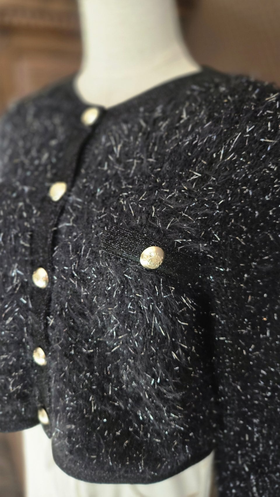ラメの入った長めのフェザーヤーン・スラブ調糸・球状の凹凸があるポンポンヤーンの3種類の糸を引き揃えて構成した華やかな表情の一枚。