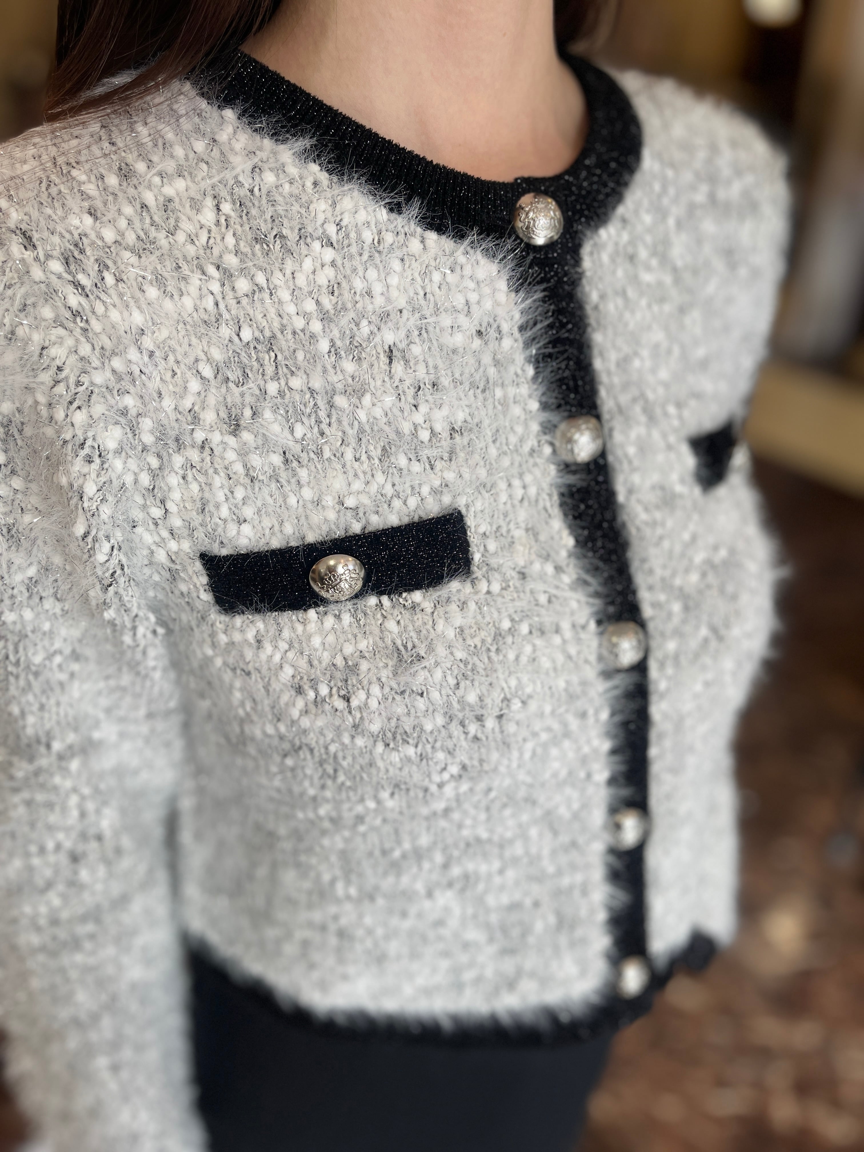 コンパクトなノーカラーデザインに大きなメタルボタンを添えて、可愛らしくなりすぎない洗練感のあるデザインに仕上げました。