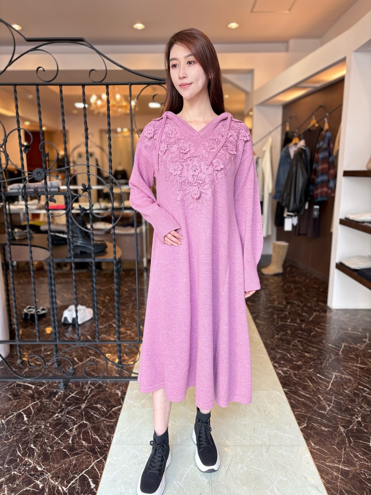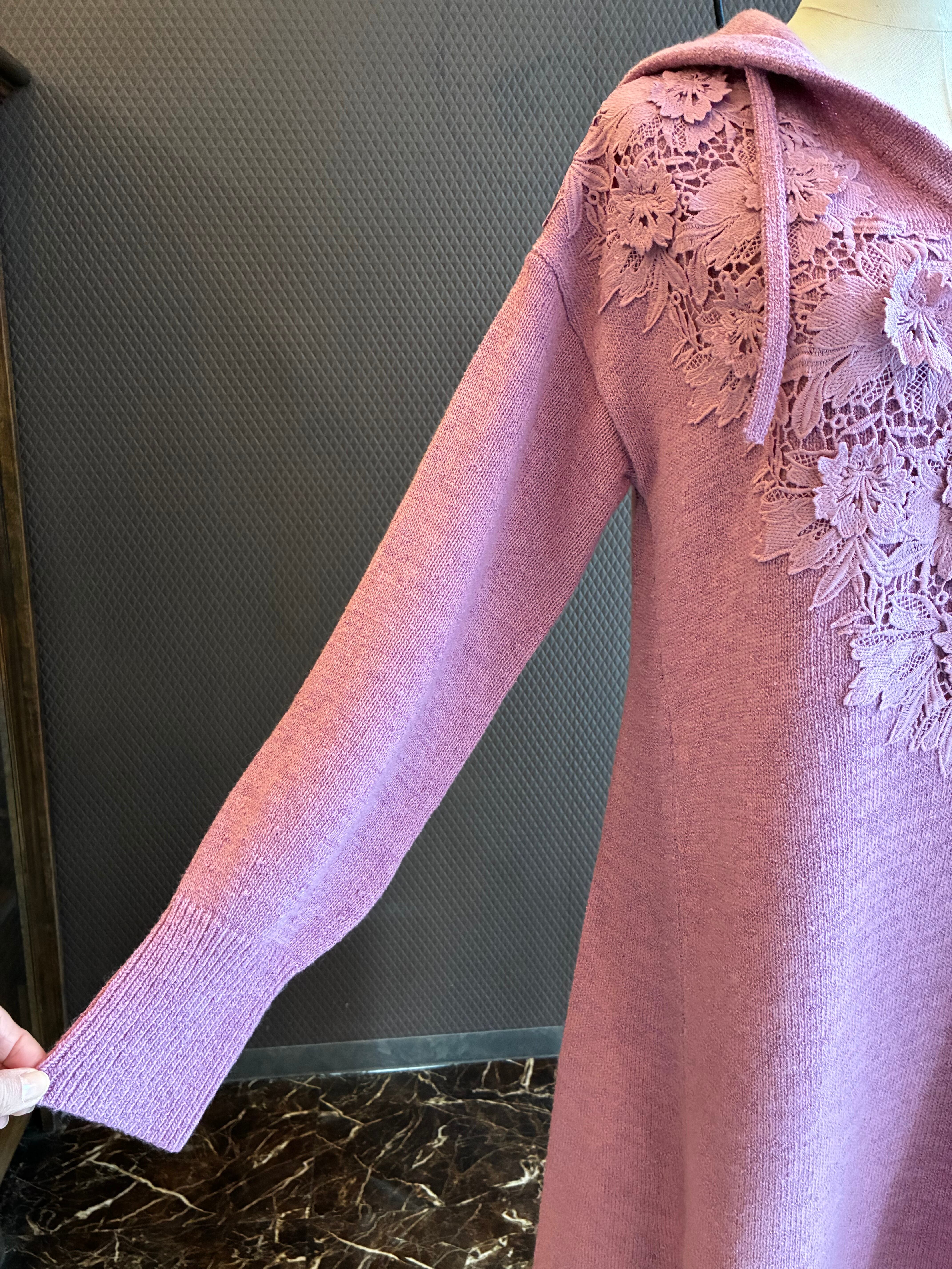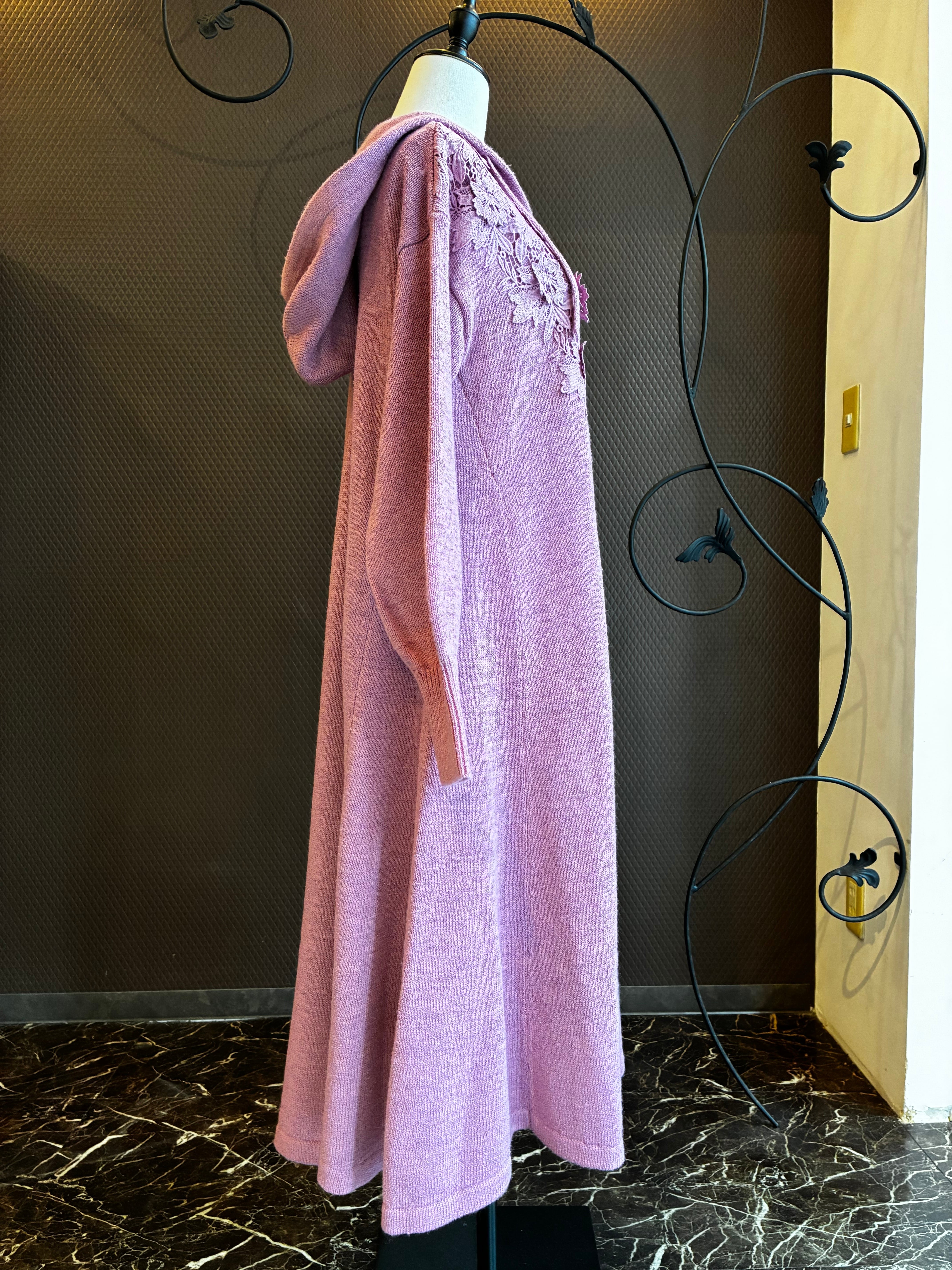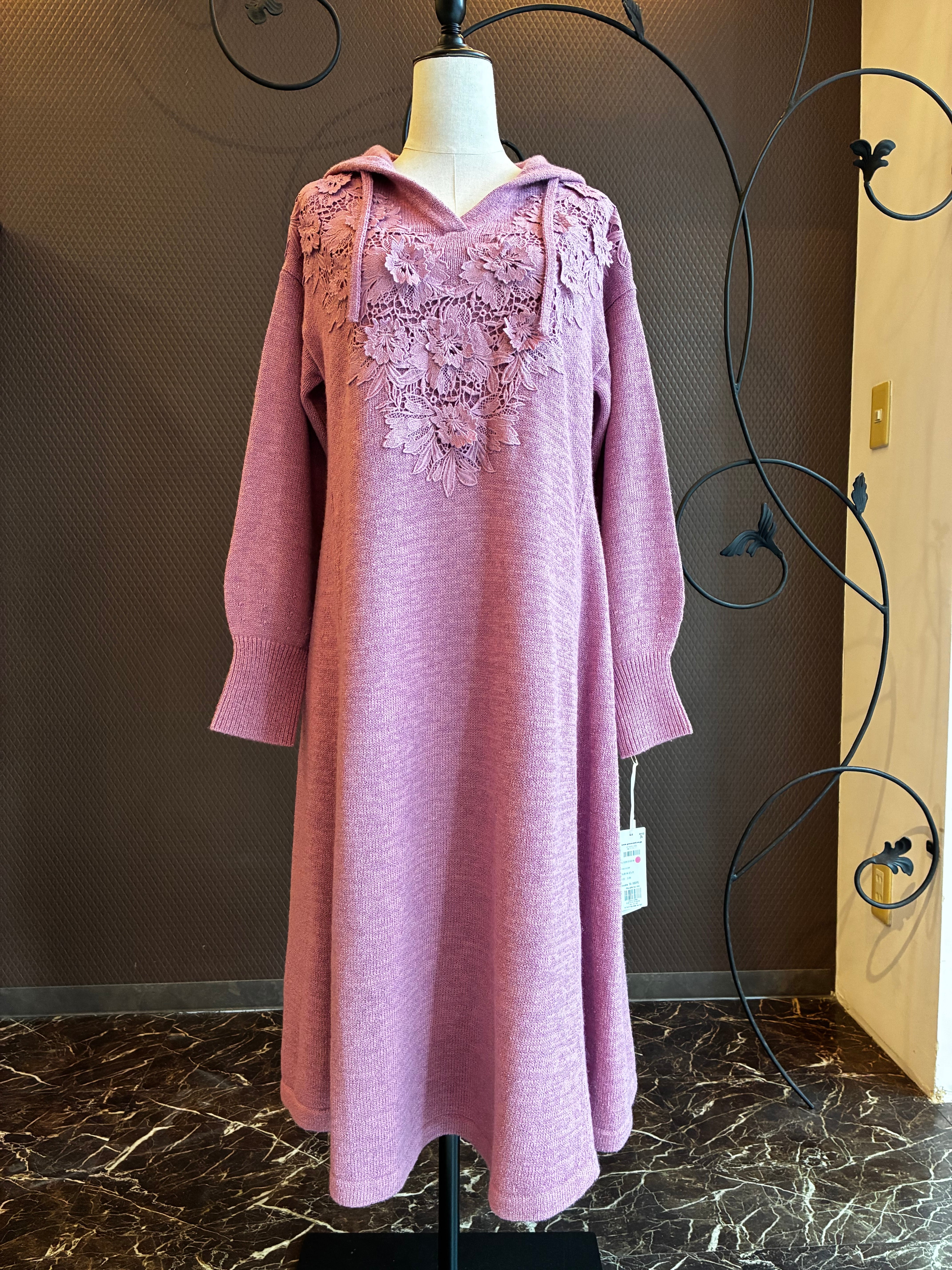 3Dの刺繍を施したケミカルレースがポイントのロング丈ニットワンピース。