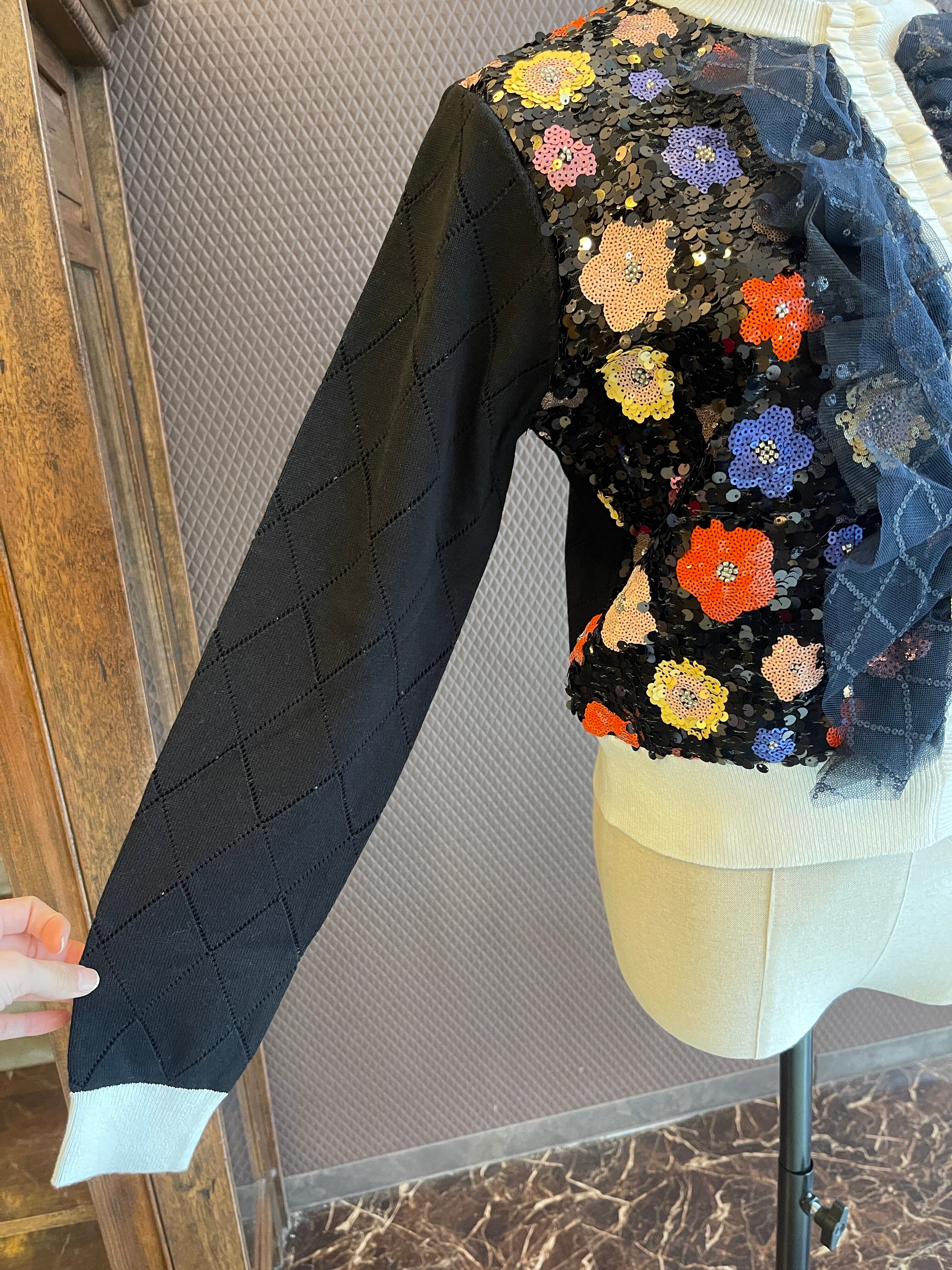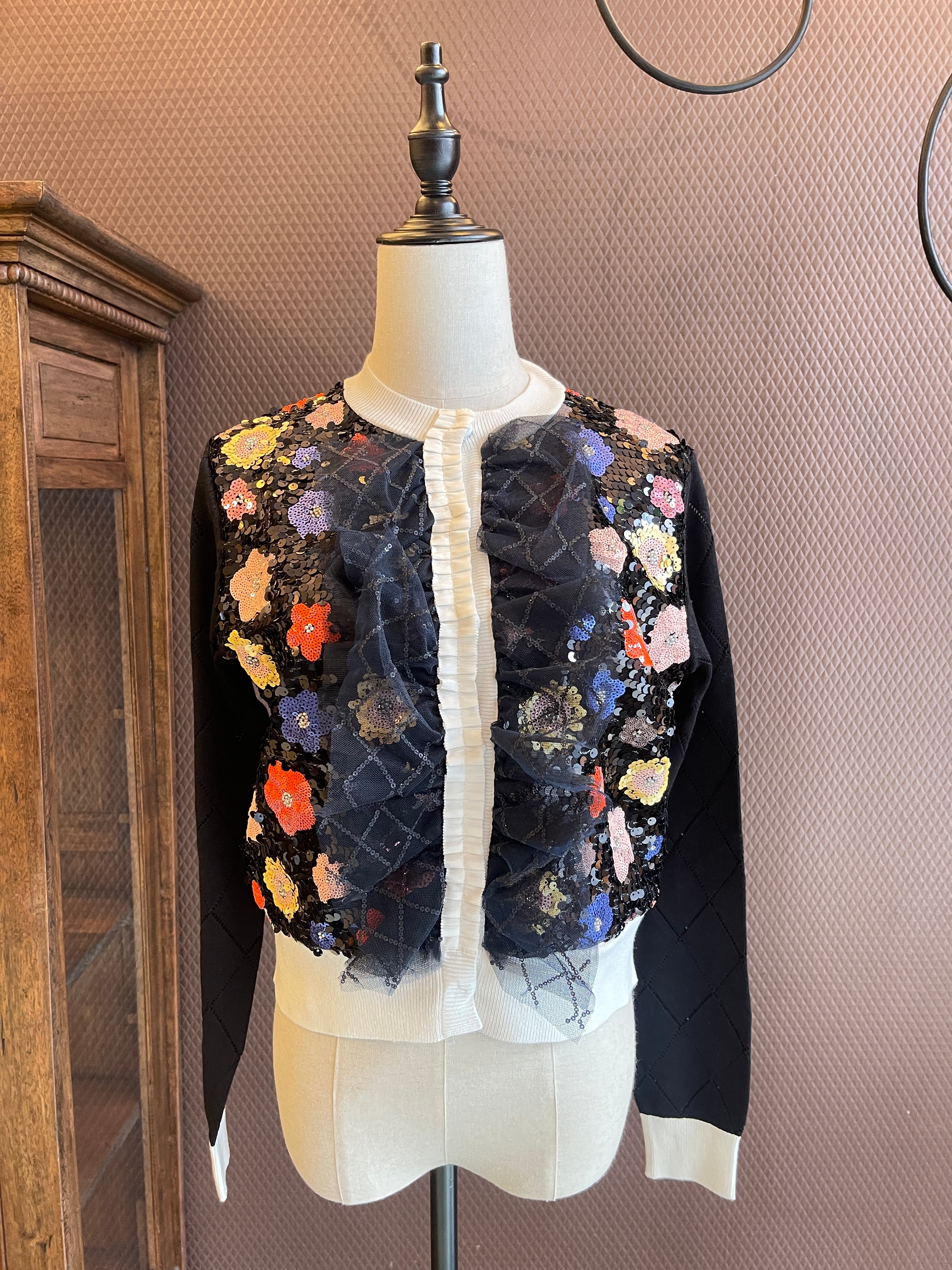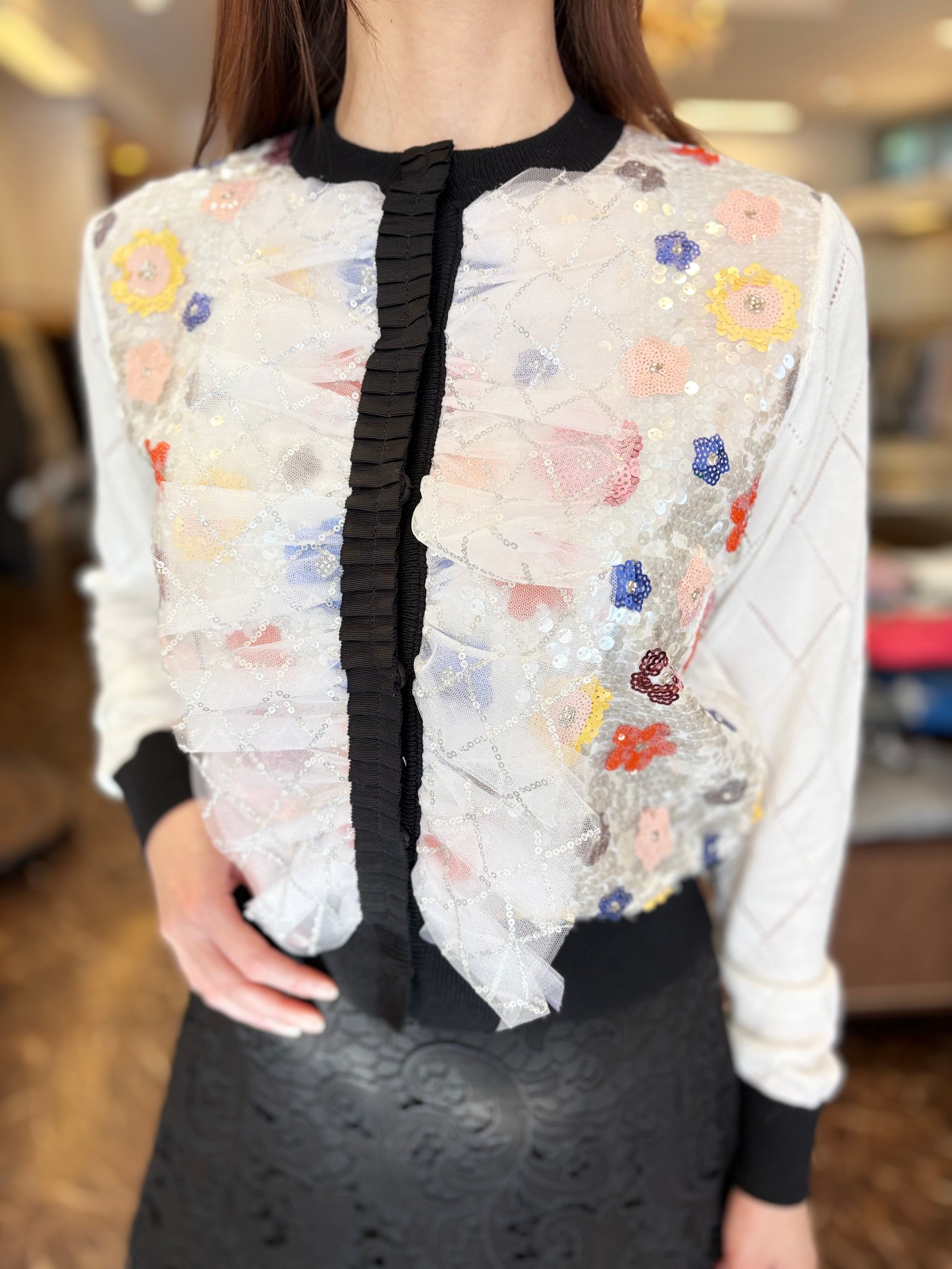 マルチカラーのスパンコールフラワー柄刺繍が美しいニットカーディガンです。
