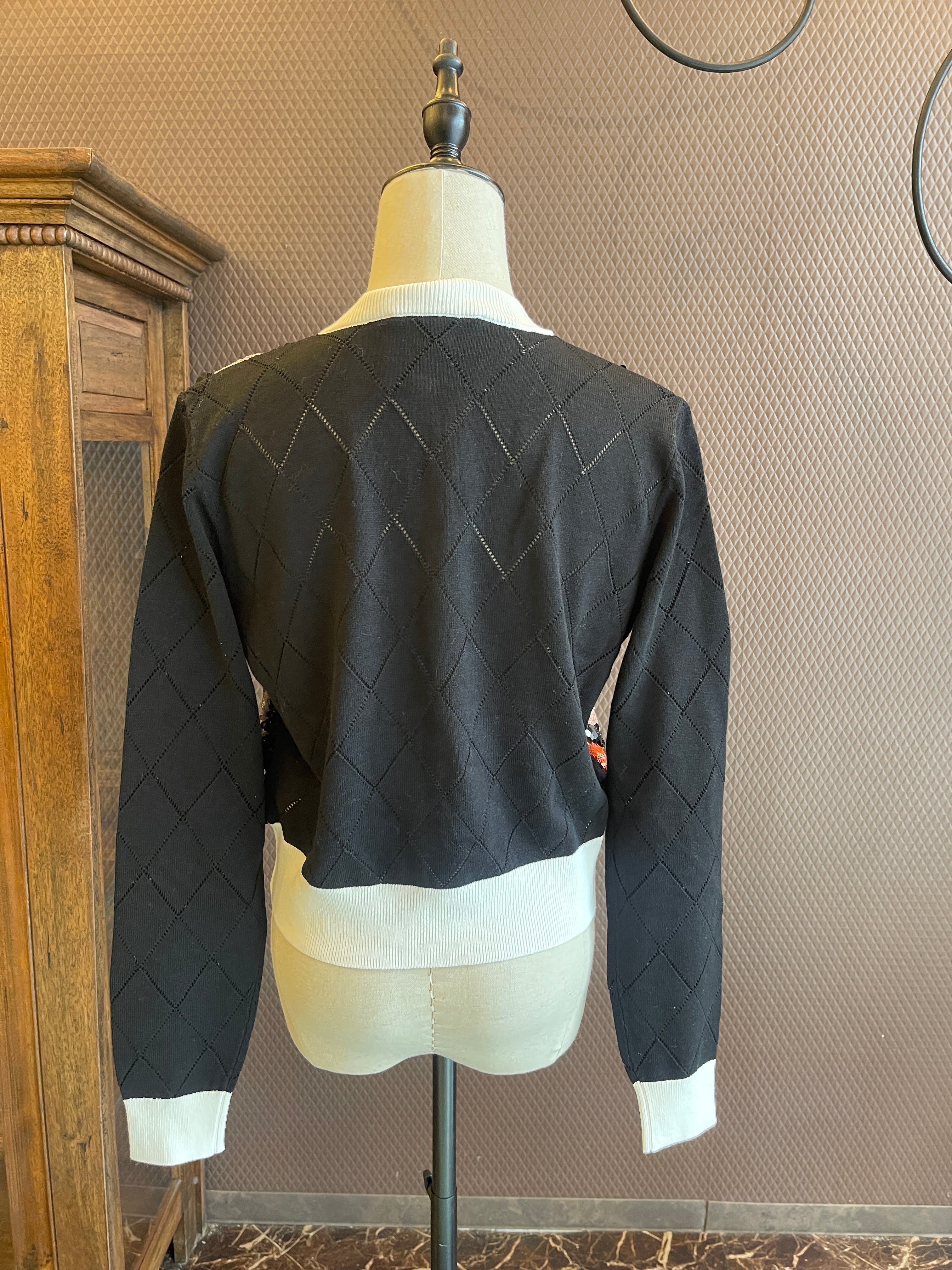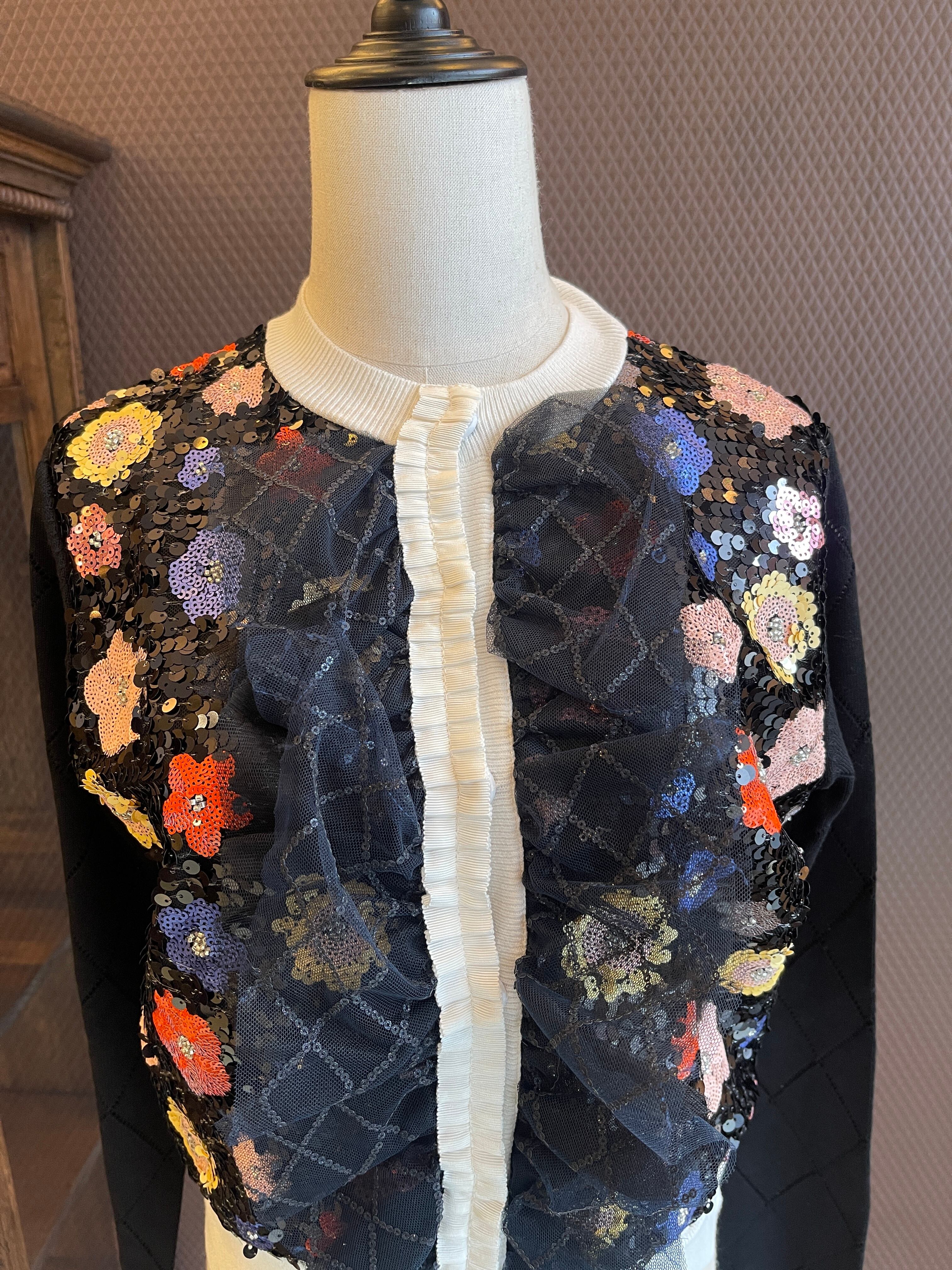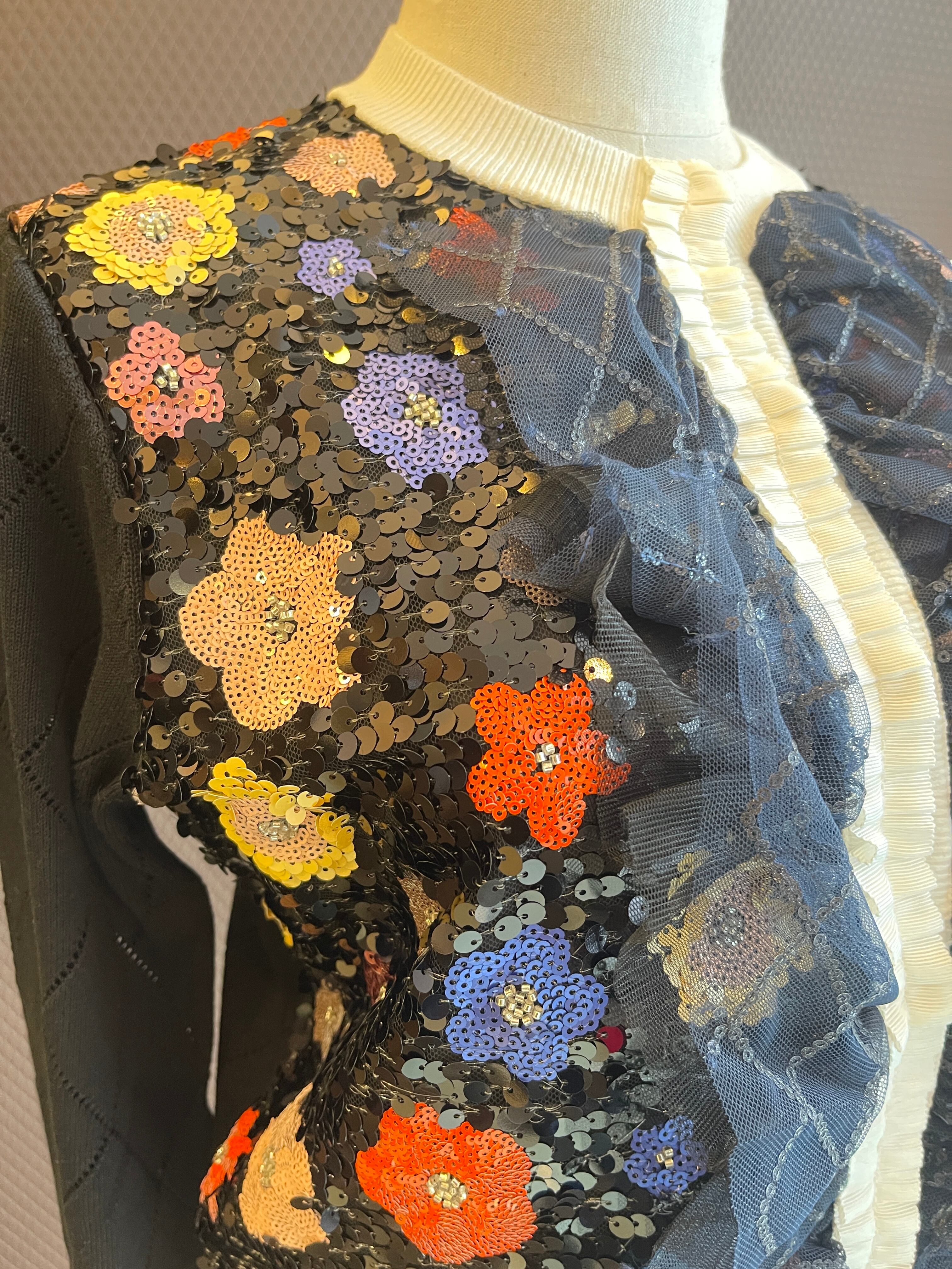 マルチカラーのスパンコールフラワー柄刺繍が美しいニットカーディガンです。