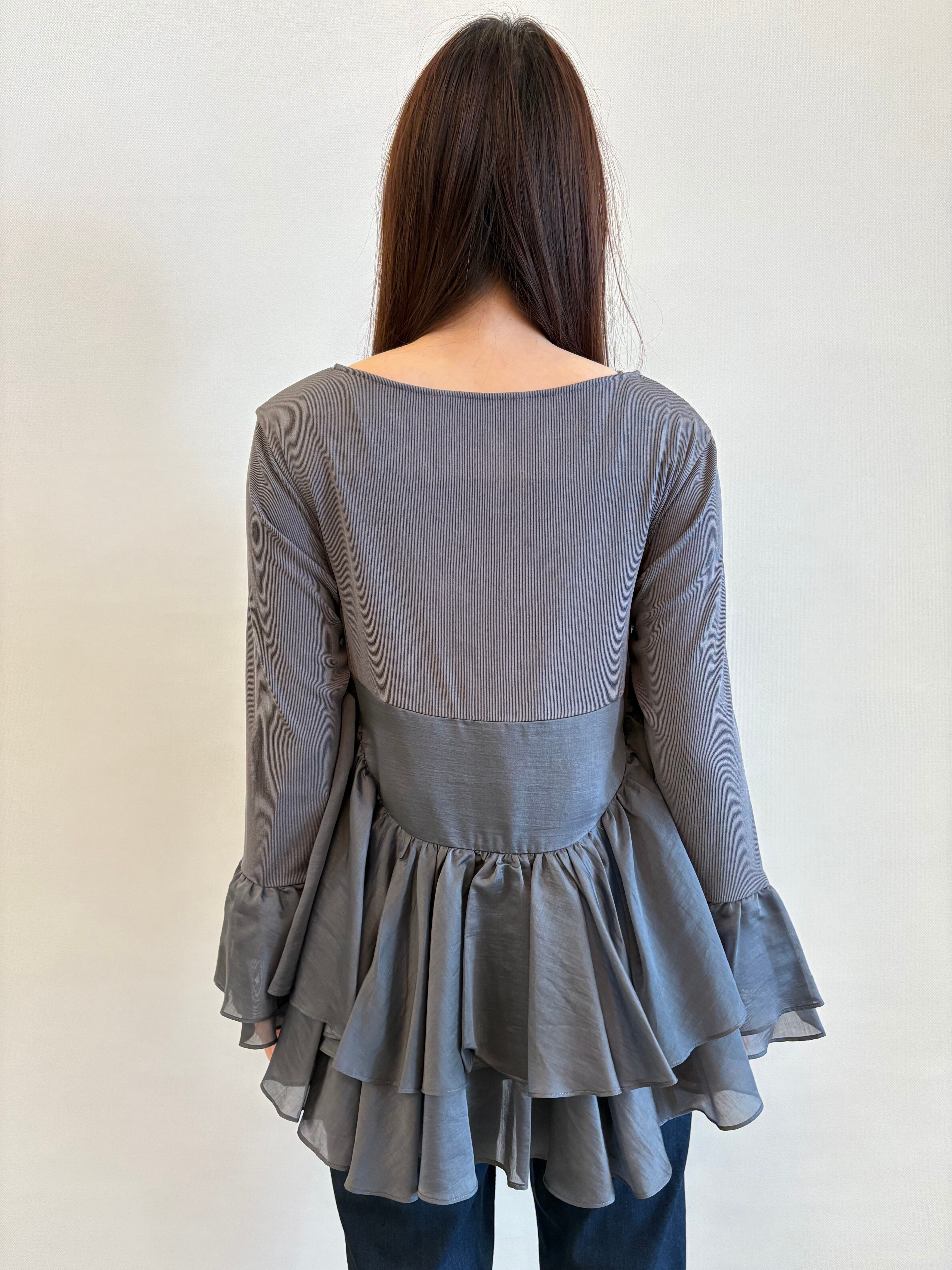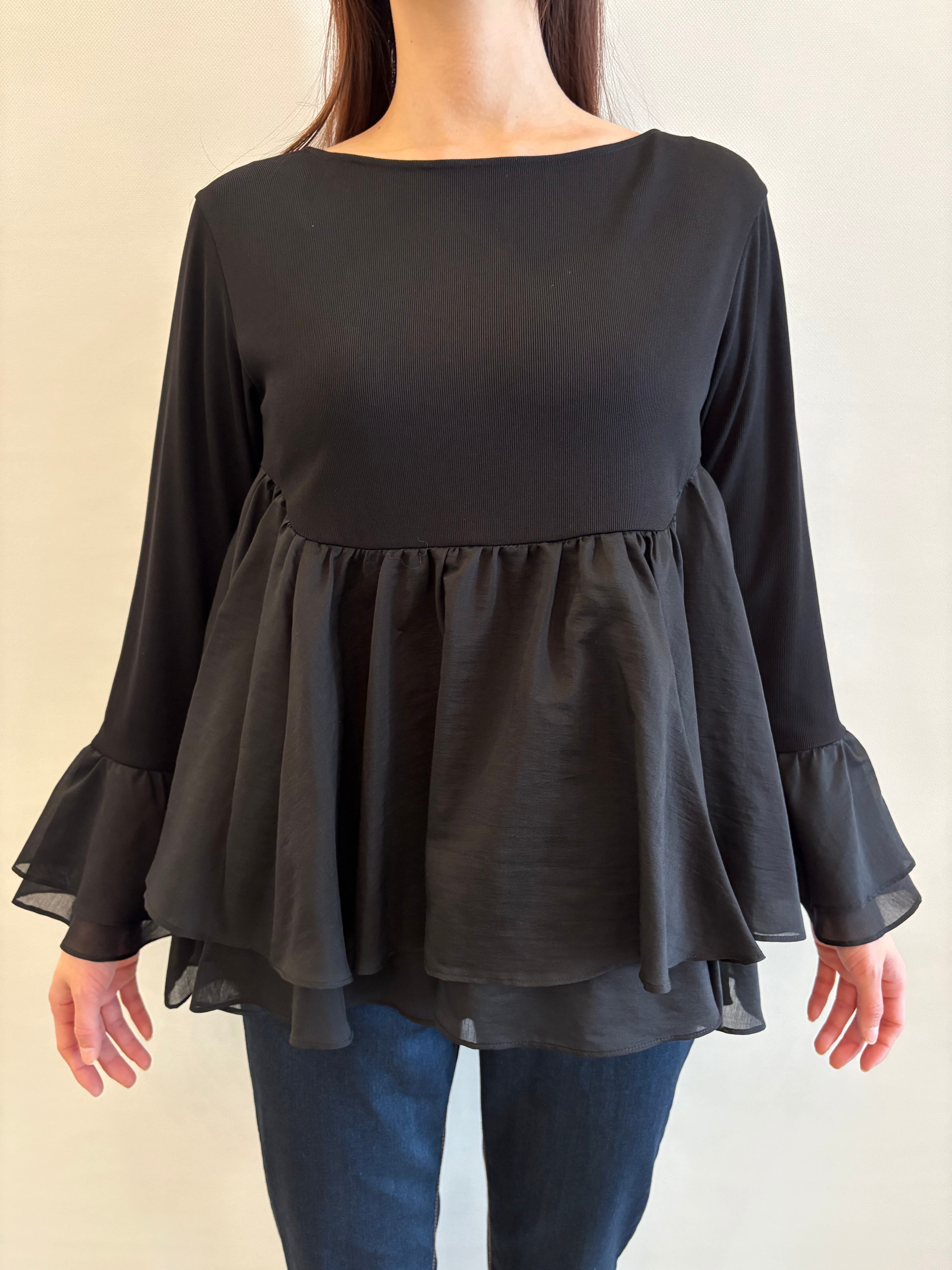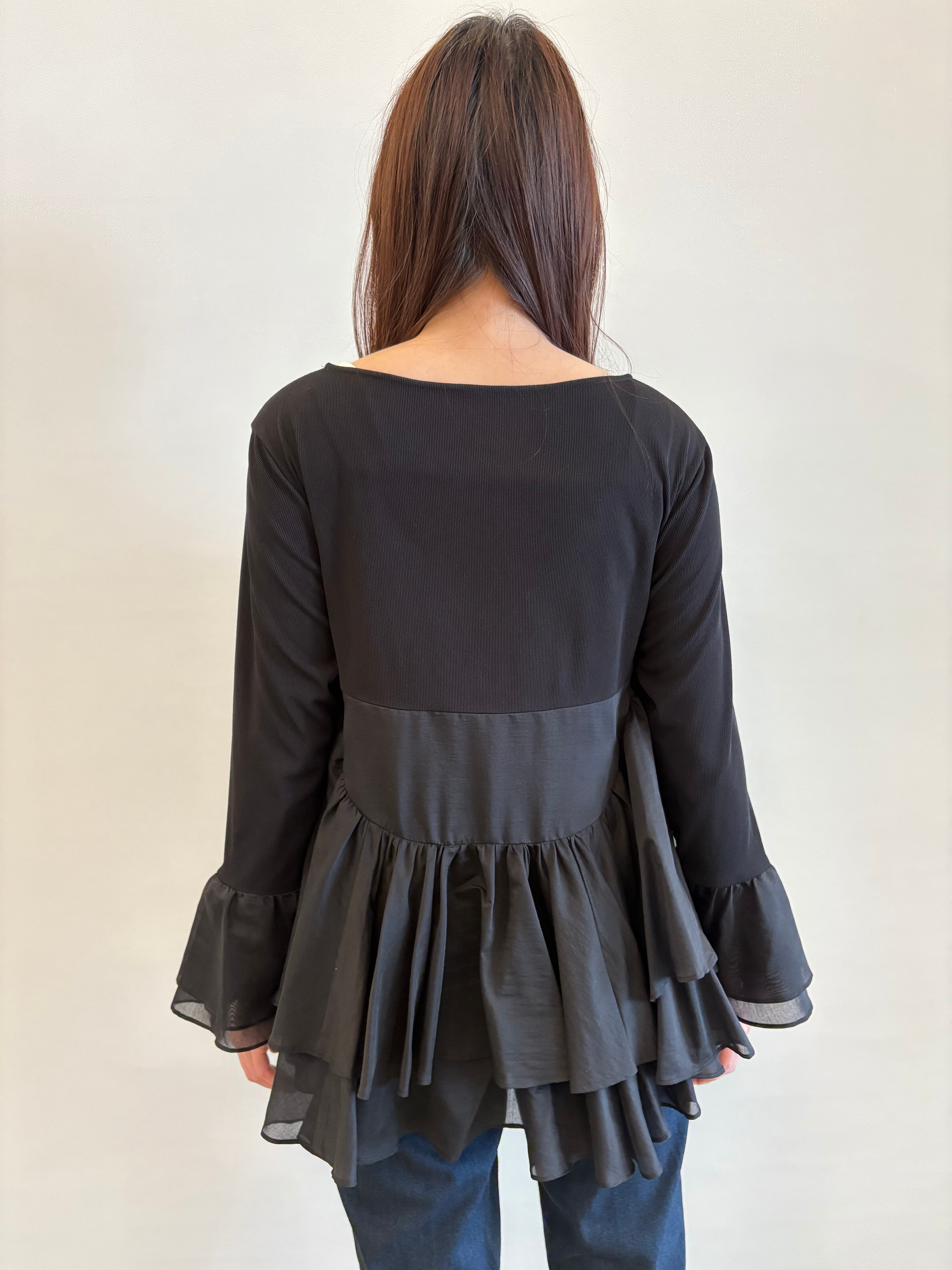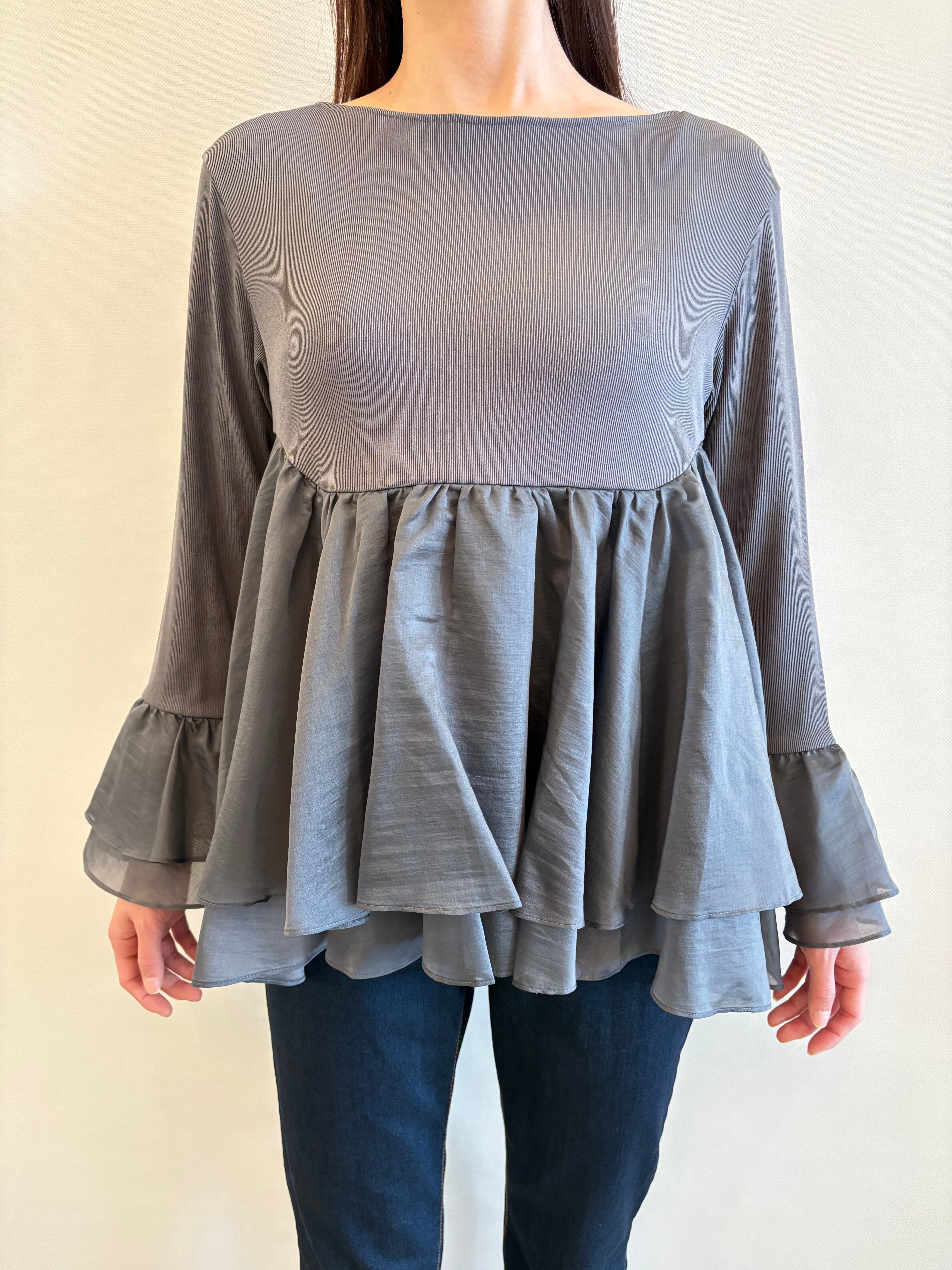 程よいシアー感のある合繊素材を、ティアード状にドッキングしたカットトップ。