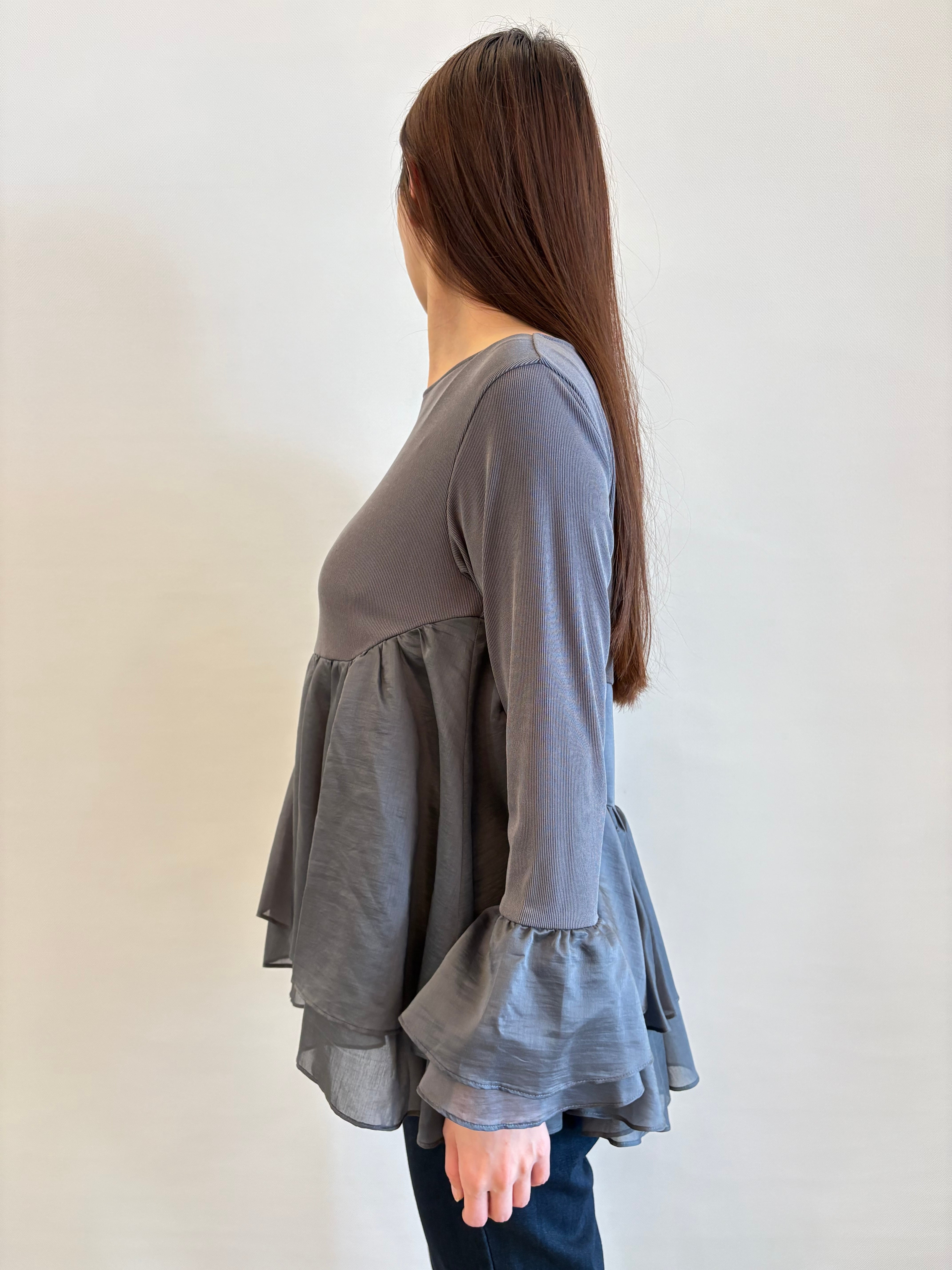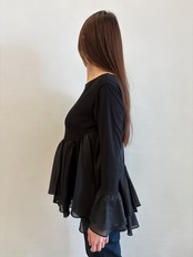 着心地の良いカットソー素材に、ほんのり透け感のあるシルキーなタッチのブラウス地をレイヤードしたデザイン。