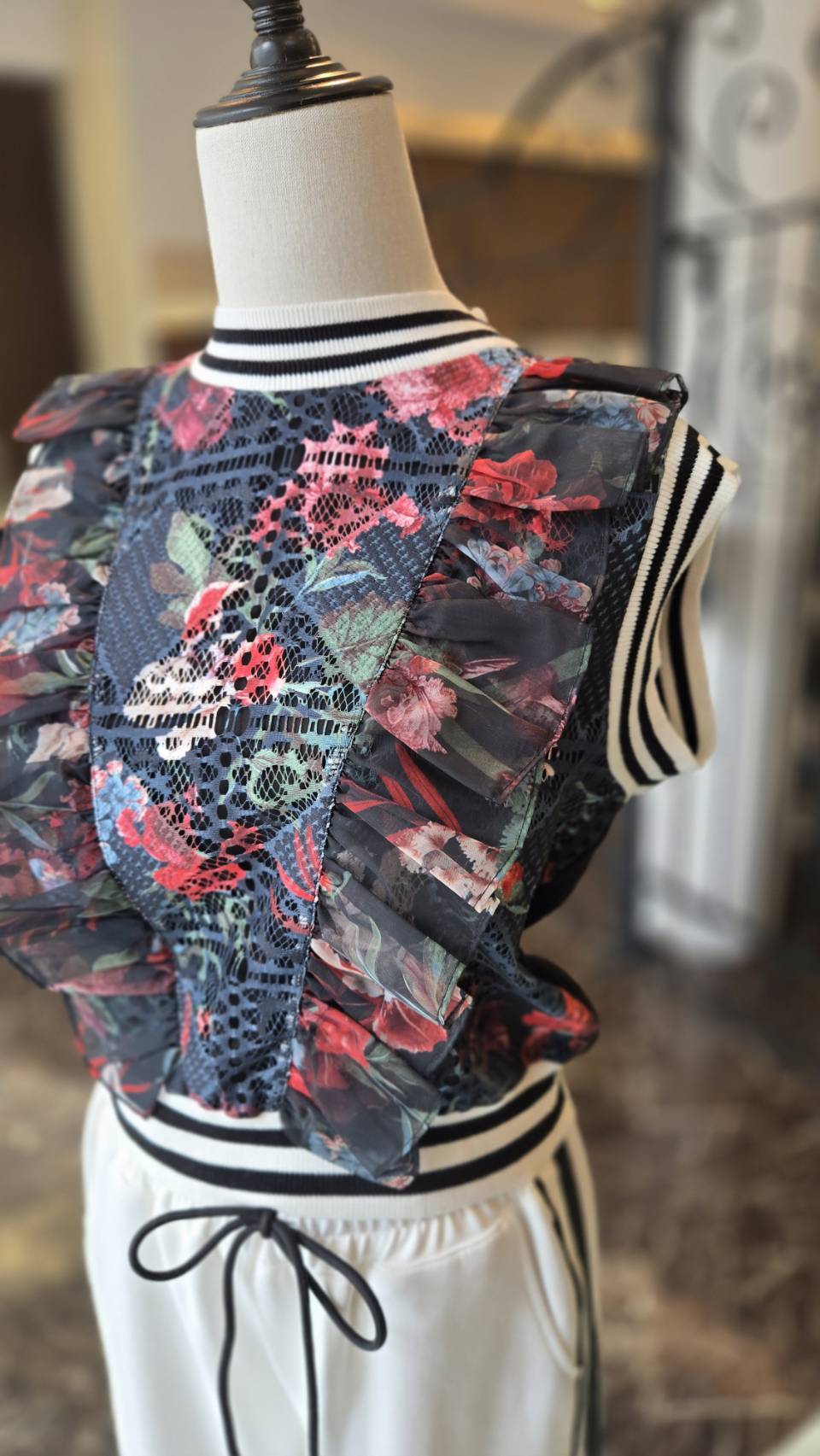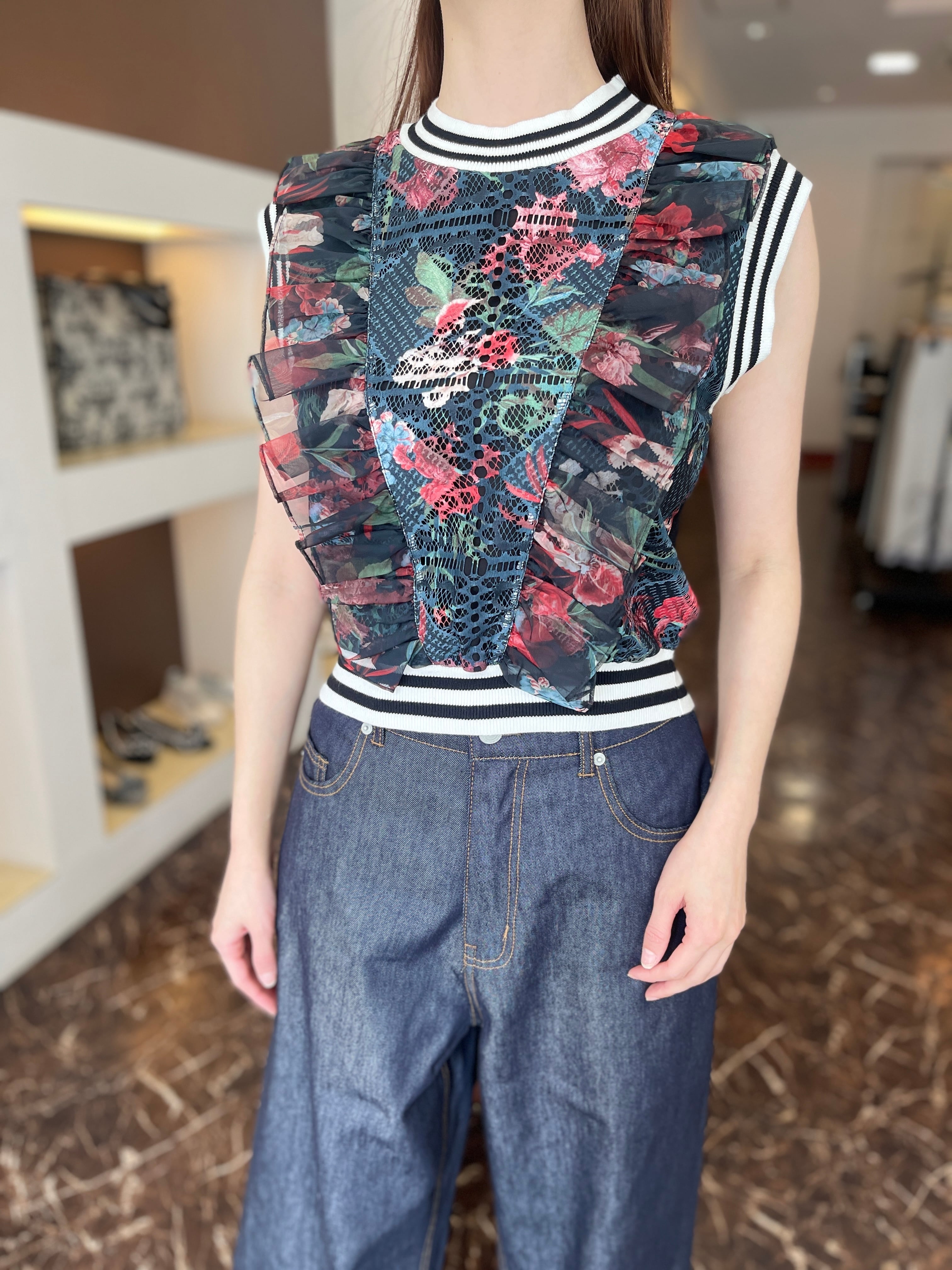 繊細なフラワープリントを重ねたレースとシフォンのフリルが華やかなニットトップです。