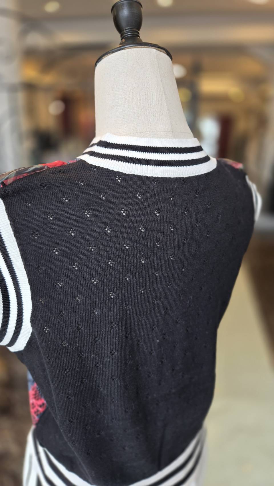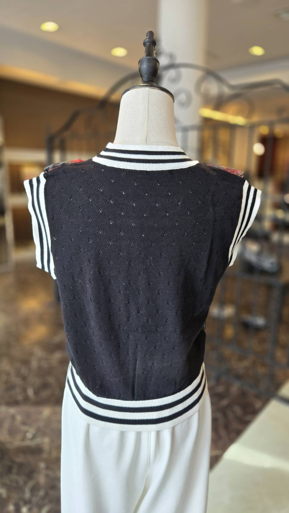 ハイゲージのニットのバックスタイルは透かし編みで上品に。