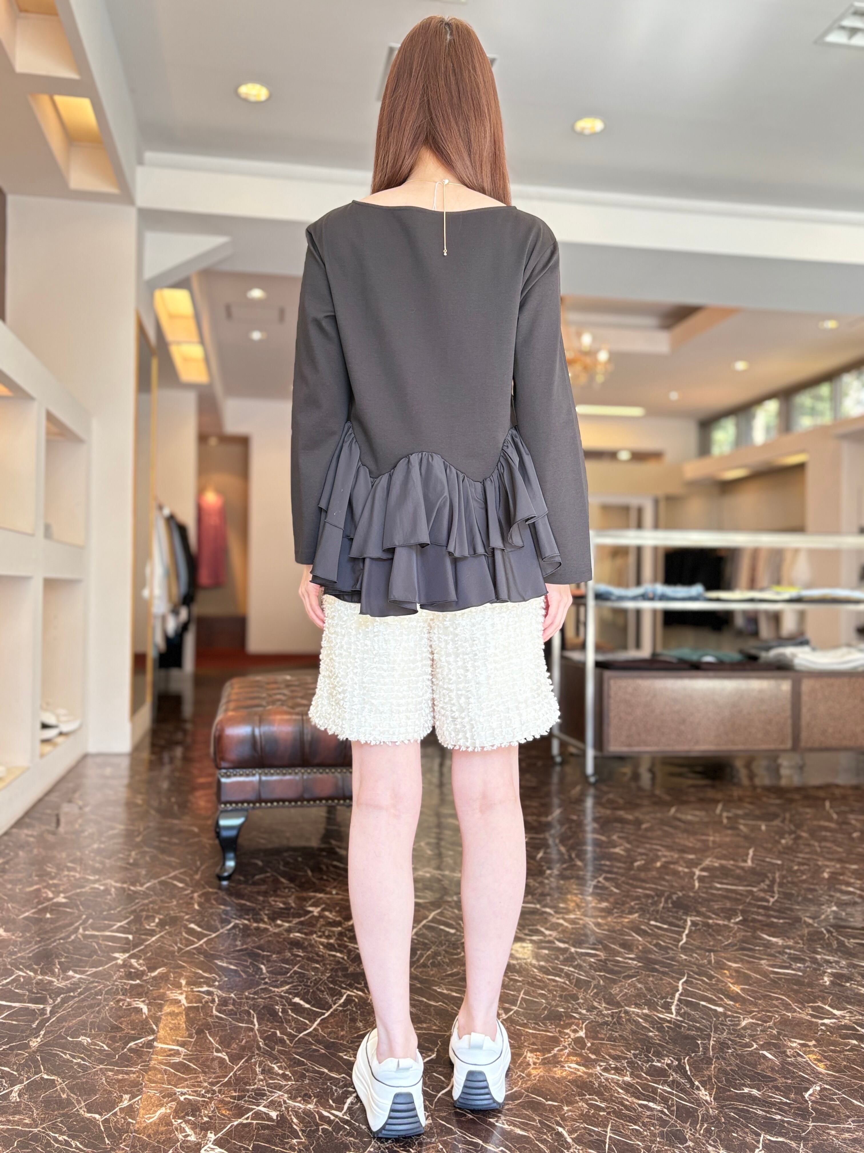 シアー感のある基布に開いた緯糸が華やかなカットジャガード素材のハーフパンツ。