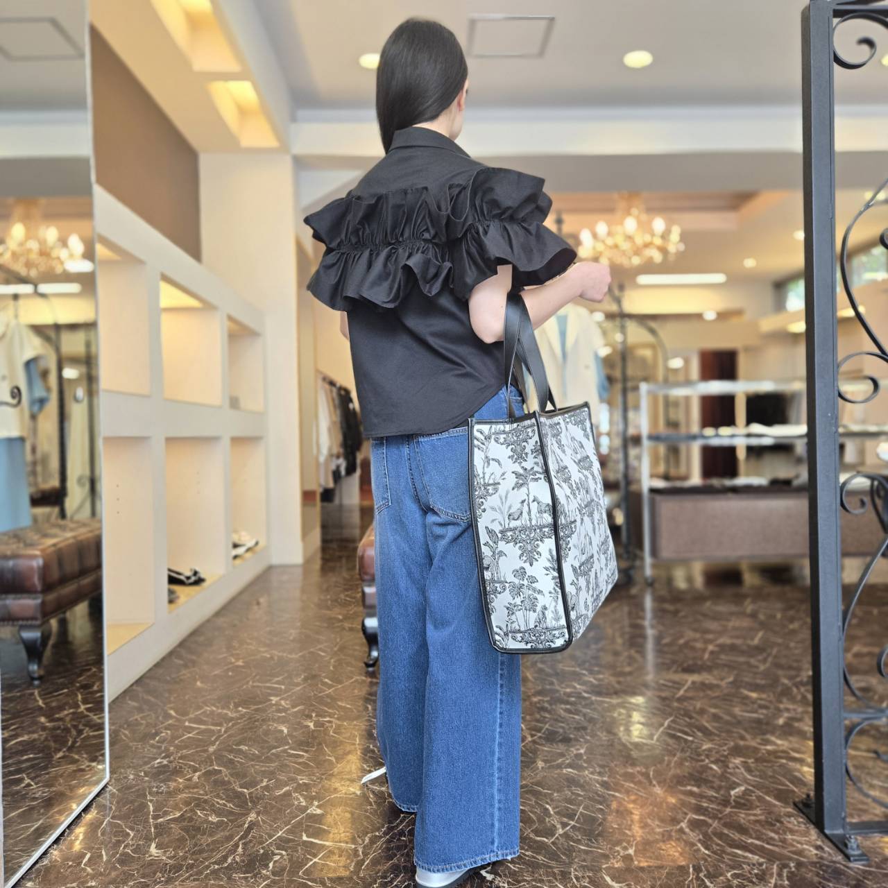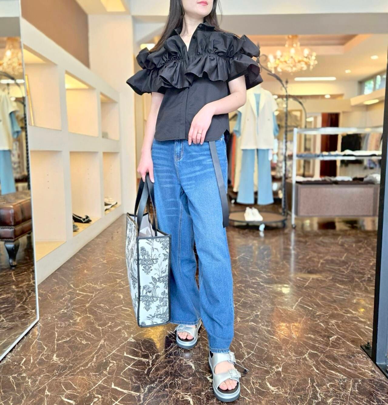 シンプルなボトムも、一気に華やかなコーディネートになるアイテムです。