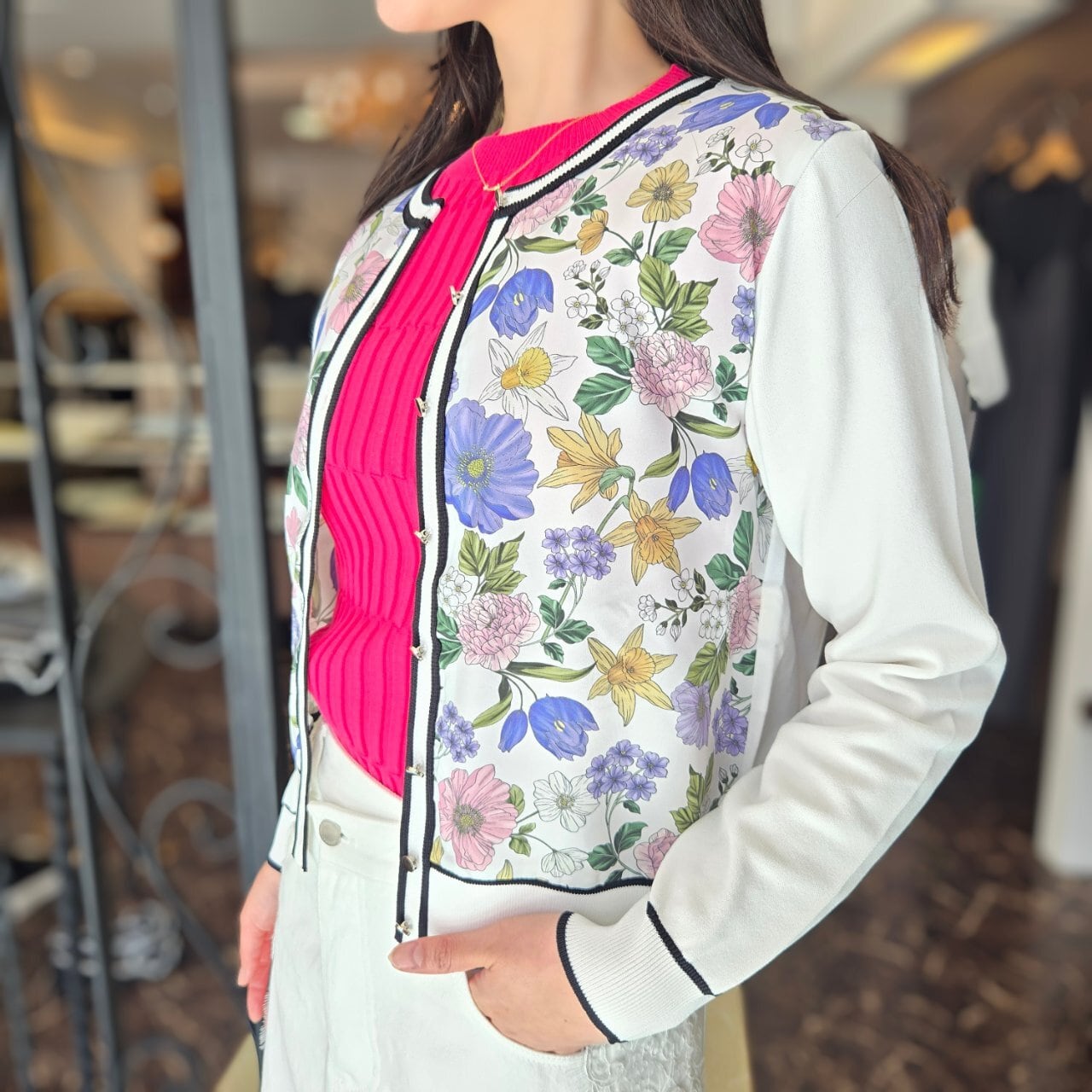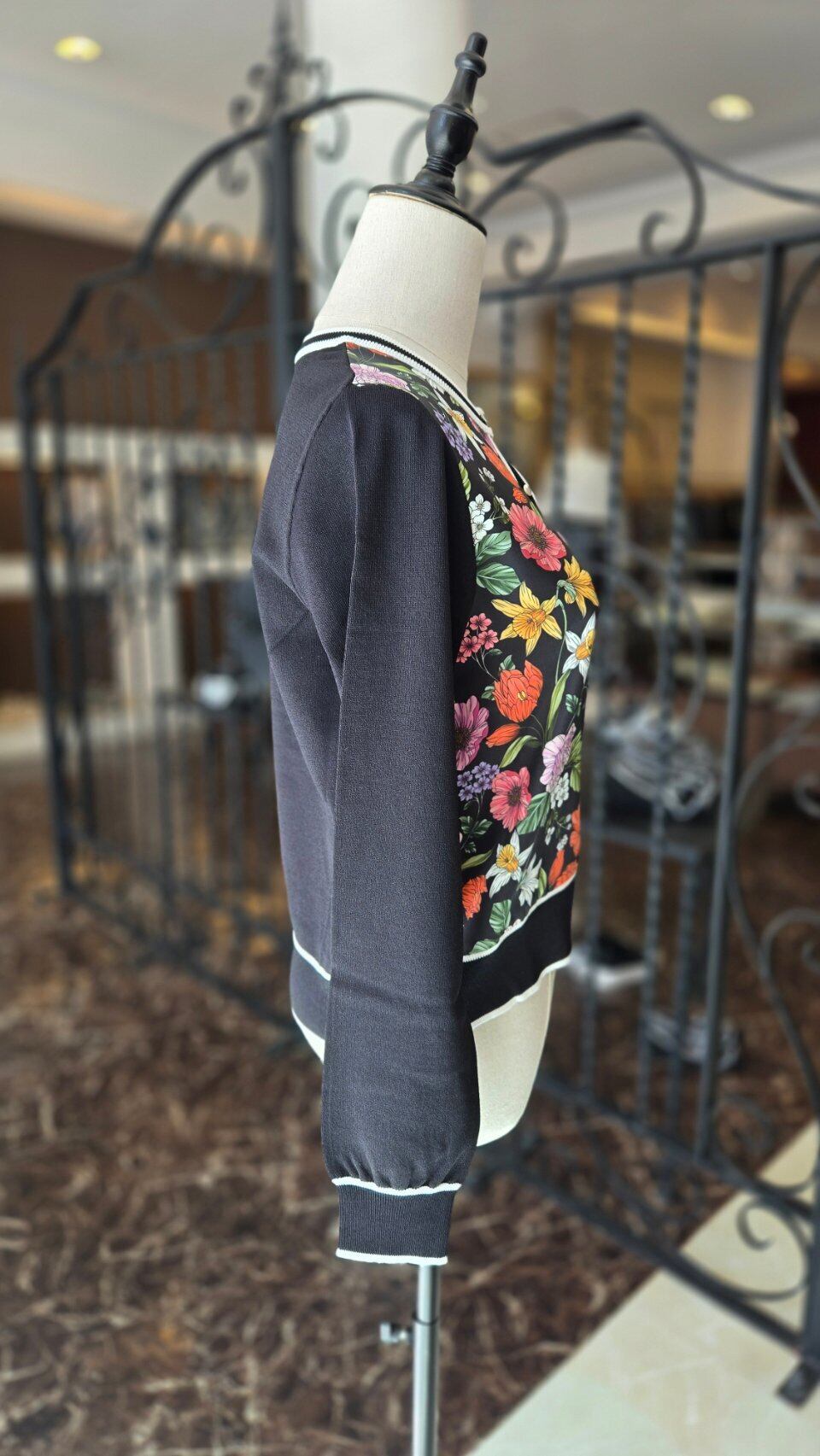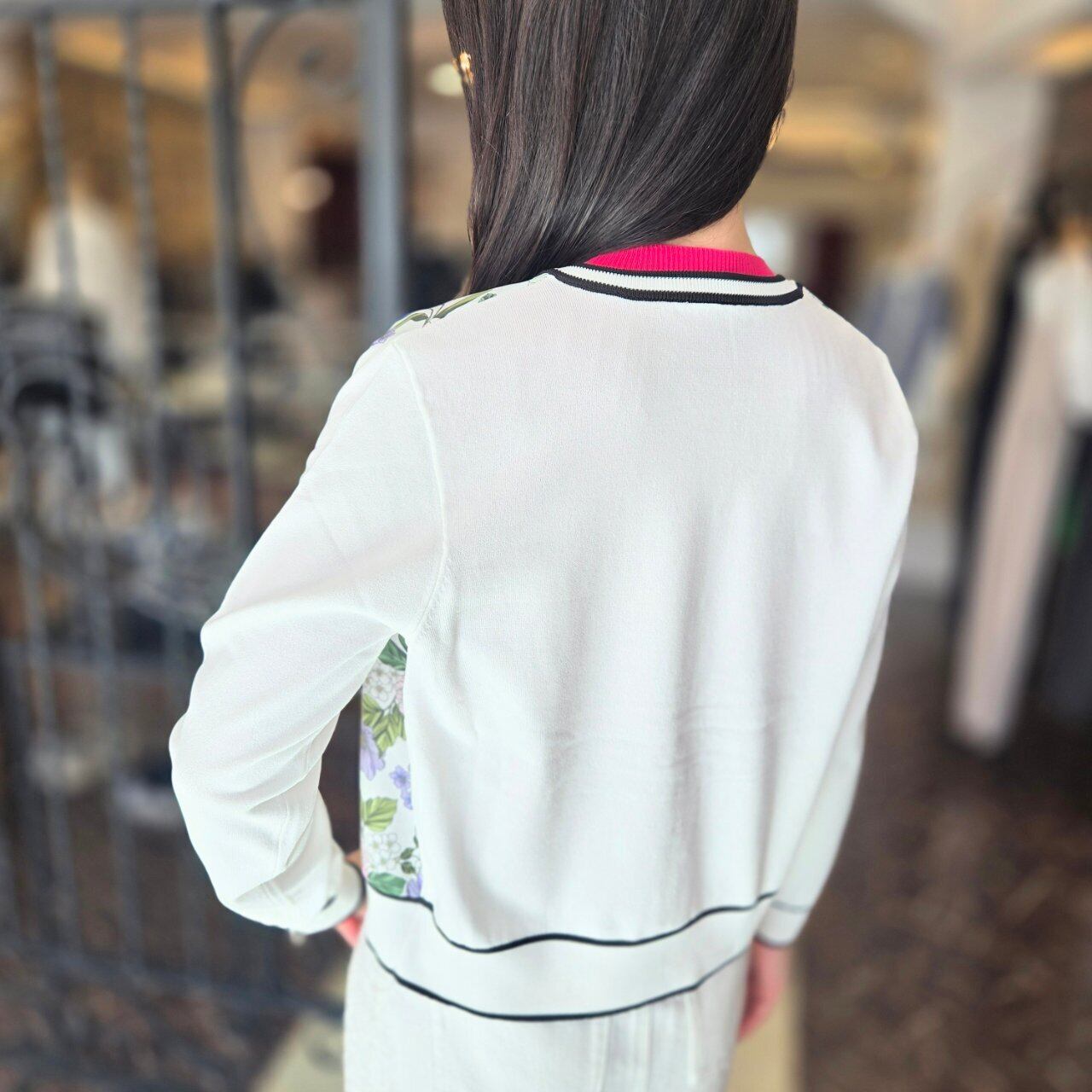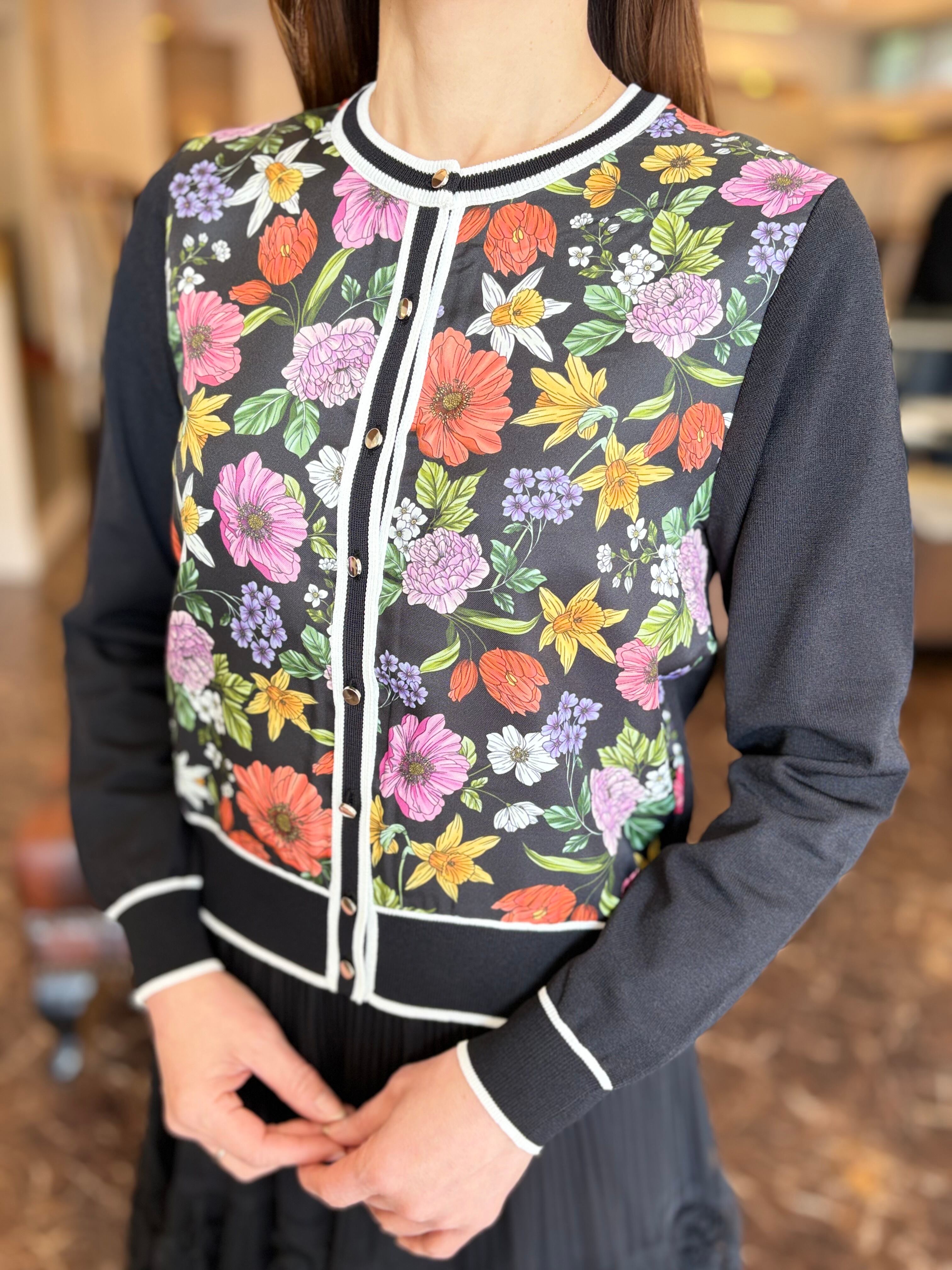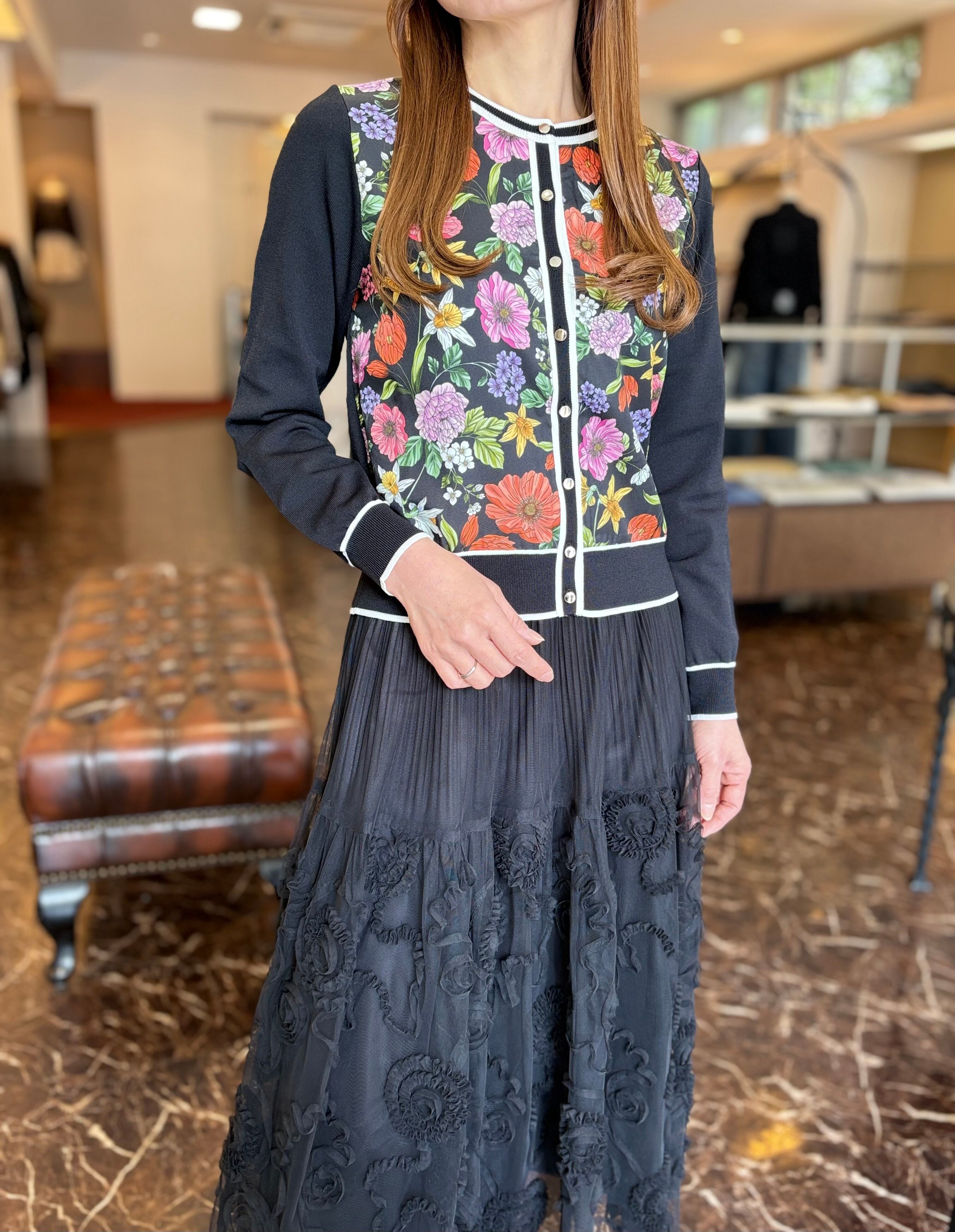 華やかなフラワープリントを施したツイル生地を前見頃に切り替えたニットカーディガン。